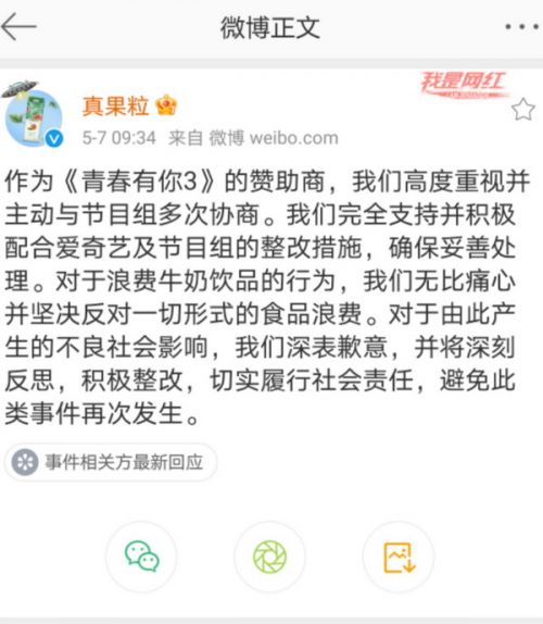 蒙牛真果粒5月7日经由过程官方微博道歉:作为《青春有你3》的辅助商